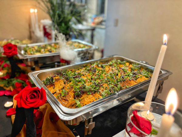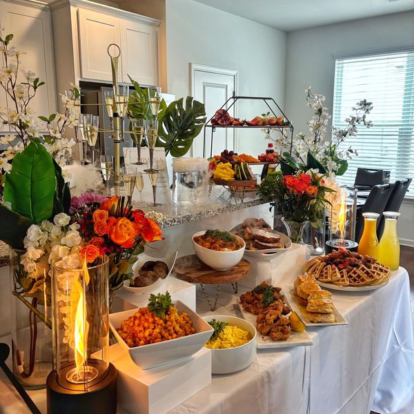Designed for smaller gatherings, our intimate buffet style brings a warm, home-like feel with a touch of elegance. We transform your kitchen or dining space into a beautiful setup complete with decorative centerpieces and heat lamps to keep your dishes perfectly warm. All food is prepared fresh right in the privacy of your own home, then presented on white centerpiece dishes or other stylish serving displays that make the experience both cozy and refined.