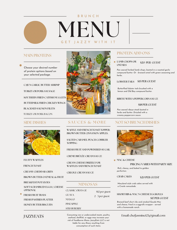 Indulge in the ultimate dining experience with JazzyEats Chef Services's personalized chef services. Let me bring my culinary expertise to your home or event and create a customized menu that will delight your taste buds. With years of experience in the industry, I pride myself on using only the highest quality ingredients to create dishes that are not only delicious but also visually stunning. Whether it's an intimate dinner for two or a large event, I will work with you to ensure that your culinary vision is realized. Contact me today to learn more about my services and how I can help make your next dining experience unforgettable.